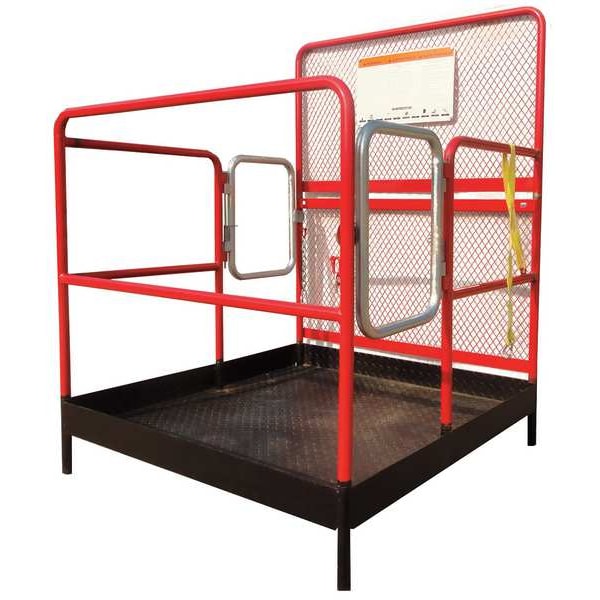 SKU G2127837CategoriesDescription Forklift Work Platform, Base Length 48 in, Base Width 48 in, Platform Length 48 in, Platform Width 48 in, Overall Height 66 in, Handrail Height 42 in, Fork Pocket Size 2 1/2 in x 7 1/2 in, Number of Guard Rails 3, Tread Perforated, Red/Black, Finish Powder Coated, For Use With Most Forklift Trucks, Unassembled, Includes Backrail, Dual Doors, Guardrails, Safety Strap, Load Capacity 1,000 lbgraingerSKU: 5UEW5, mscSKU: , zoro_no: G2127837, mongo_id: 65bbe6073aaddbd5a90020c2