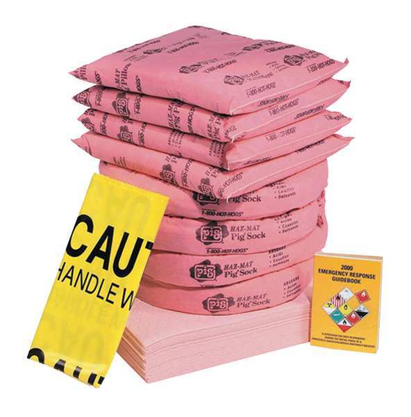 SKU G8271313CategoriesDescription Spill Kit Refill, Fluids Absorbed Acids, Bases, Volume Absorbed Per Kit 63 gal, Container Type Box, 22 in W x 22 in L x 20 in H Container Size, Pink, Filled, Sorbents Included (12) 3 in D x 46 in L Absorbent Chemical Sock (124CR), (2) Ext. dia. 5 in x 10 ft L Pig HazMat Chemical Absorbent Dike (HA1010), (6) 3 in D x 10 ft L Absorbent Chemical Sock (Pig301), (7) 17 in W x 16 in L x 2 in H Harsh Chemical Absorbent Pillow (HR7015), (75) 15 in W x 20 in L Absorbent Mat Pad (MAT301)graingerSKU: 30RF08, mscSKU: , zoro_no: G8271313, mongo_id: 65bbe8479a749db822783d54