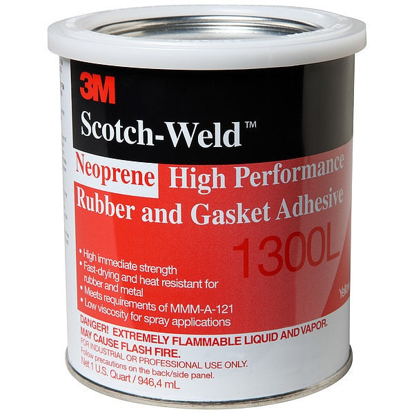 Description Gasket Adhesive, Color Yellow, Container Size 32 fl oz, Container Type Can, Full Cure Time 1 day, Cure Type Room Temperature, Maximum Operating Temperature 300 Degrees F, Minimum Operating Temperature -30 Degrees F, Series 1300L, Working Time 12 min, Product Form Liquid, For Fluid Type Water, For Material Type Metal, Butyl Rubber, Neoprene, Plastic, SBR, Wood, Resistance Properties Water Resistant, Standards MMM-A-121, VOC Content 657 g/L, Chemical Base Polychloroprene