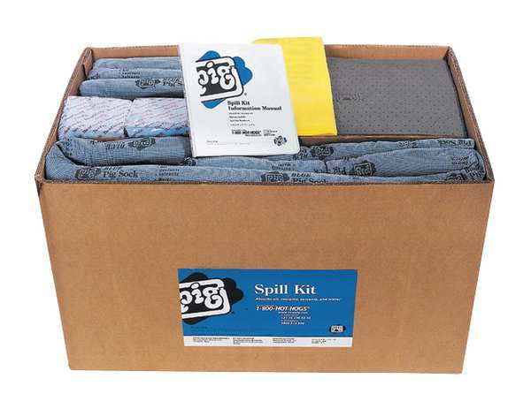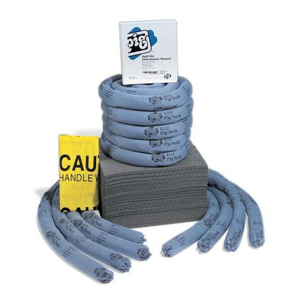 Description Spill Kit Refill, Fluids Absorbed Universal, Volume Absorbed Per Kit 38 gal, Container Type Box, 19 1/2 in W x 35 1/2 in L x 19 in H Container Size, Gray, Filled, Sorbents Included (100) 15 in W x 20 in L Pig Absorbent Mat Pad (MAT203), (5) 3 in Dia. x 10 ft L Pig Blue Absorbent Sock (Pig202), (8) 3 in Dia. x 48 in L Pig Blue Absorbent Sock (4048), Additional Components Included (10) 18 in W x 30 in H Polyethylene Disposal Bags (BAG20-1S), Instructions, Lockable No, Static Dissipative No