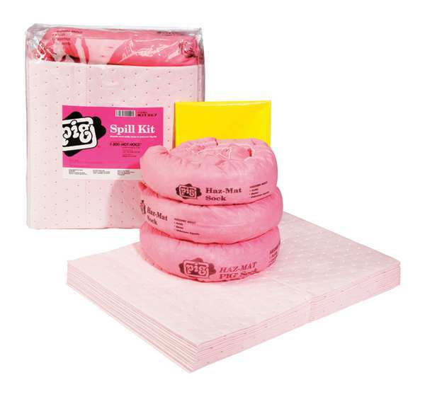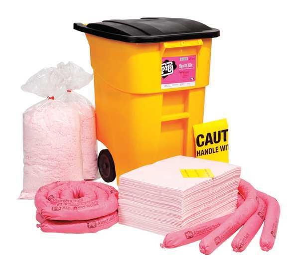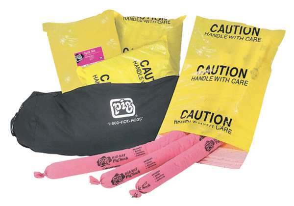 Description Spill Kit, Fluids Absorbed Acids, Bases, For Use With Chemical or Metal Type Acids, Bases, Volume Absorbed Per Kit 20 gal, Container Type Portable Bag, 25 in W x 48 in L Container Size, Black, Filled, Sorbents Included (12) Ext. Dia. 3 in x 46 in L Pig Harsh Chemical Absorbent Sock (124CR), (48) 15 in W x 20 in L Pig Harsh Chemical Absorbent Mat Pad (MAT301), Additional Components Included (4) Instructions, (8) 18 in W x 30 in H Polyethylene Disposal Bags (BAG20-1S), Canvas Duffel Bag
