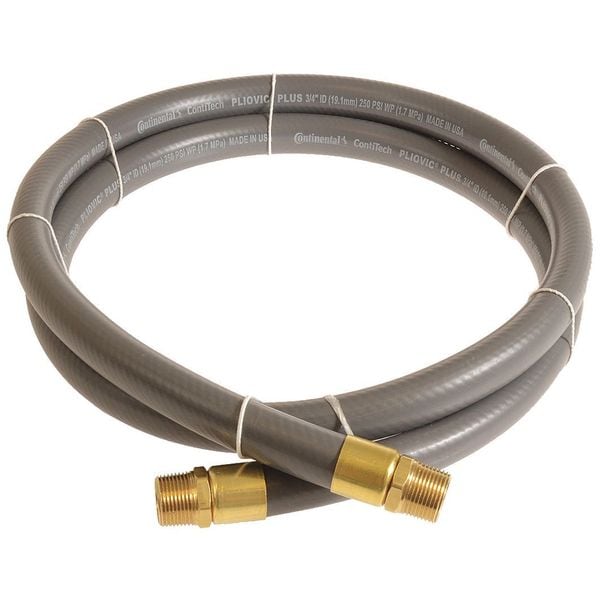 Description Air Hose, Hose Inside Dia. 3/4 in, Hose Outside Dia. 1 1/8 in, Hose Length 10 ft, Hose Color Gray, Hose Tube Material PVC, Hose Cover Material PVC, Burst Pressure 1,000 psi, Max. Working Pressure @ 70 F 250 psi, Temp. Range -10 Degrees to 158 Degrees F, Hose Reinforcement Type Spiral, Hose Reinforcement Material Polyethylene, Safety Factor 4:1, Hose Fitting A Material Brass, Hose Fitting B Material Brass, Hose Fitting A Type MNPT, Hose Fitting B Type MNPT, Hose Fitting A Size 3/4 in