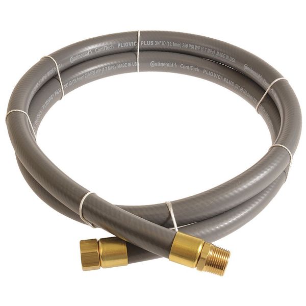 Description Air Hose, Hose Inside Dia. 3/4 in, Hose Outside Dia. 1 1/8 in, Hose Length 5 ft, Hose Color Gray, Hose Tube Material PVC, Hose Cover Material PVC, Burst Pressure 1,000 psi, Max. Working Pressure @ 70 F 250 psi, Temp. Range -10 Degrees to 158 Degrees F, Hose Reinforcement Type Spiral, Hose Reinforcement Material Polyethylene, Safety Factor 4:1, Hose Fitting A Material Brass, Hose Fitting B Material Brass, Hose Fitting A Type FNPT, Hose Fitting B Type MNPT, Hose Fitting A Size 3/4 in