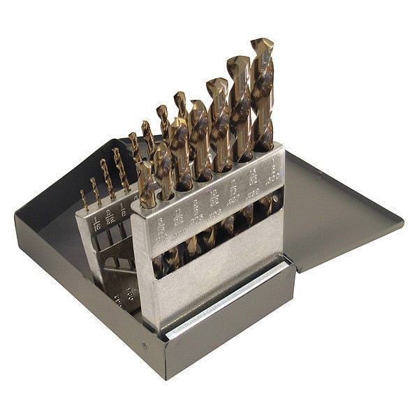 SKU G3374310CategoriesDescription Jobber Drill Bit Set, Number of Drill Bits 15, Drill Bit Point Angle 135 Degrees , Material - Machining Cobalt, Finish - Machining Straw/Bronze$176.61 / eachWeb price15pc. 135 Degrees Drill Bit SetSKU G3374310CategoriesDescription Jobber Drill Bit Set, Number of Drill Bits 15, Drill Bit Point Angle 135 Degrees , Material - Machining Cobalt, Finish - Machining Straw/Bronze$176.61 / eachWeb price