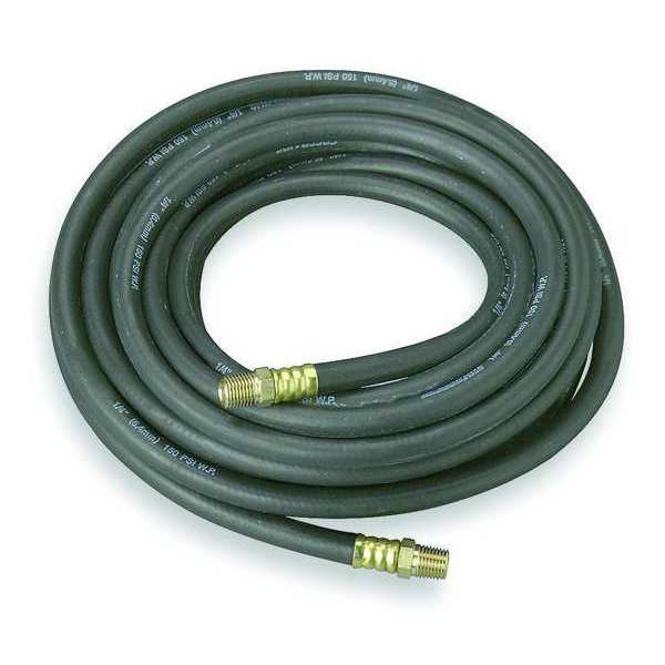Description Air Hose, Hose Inside Dia. 3/8 in, Hose Outside Dia. 5/8 in, Hose Length 25 ft, Hose Color Black, Hose Tube Material EPDM, Hose Cover Material EPDM, Max. Working Pressure @ 70 F 200 psi, Temp. Range -20 Degrees to 190 Degrees F, Standards RMA Class C, Safety Factor 4:1, Hose Fitting A Material Brass, Hose Fitting B Material Brass, Hose Fitting A Type MNPT, Hose Fitting B Type MNPT, Hose Fitting A Size 1/4 in, Hose Fitting B Size 1/4 in, Hose Configuration Coupled Assembly