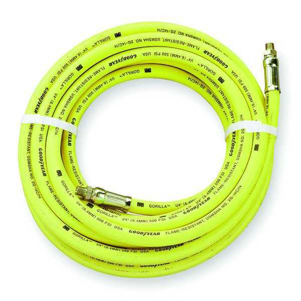 SKU G2037323CategoriesDescription Air Hose, Hose Inside Dia. 3/8 in, Hose Outside Dia. 3/4 in, Hose Length 25 ft, Hose Color Yellow, Hose Tube Material Nitrile, Hose Cover Material Carboxylated Nitrile Rubber, Max. Working Pressure @ 70 F 500 psi, Temp. Range -20 Degrees to 190 Degrees F, Standards USMSHA No. 2G-14C/14, Safety Factor 4:1, Hose Fitting A Material Carbon Steel, Hose Fitting B Material Carbon Steel, Hose Fitting A Type MNPT, Hose Fitting B Type MNPT, Hose Fitting A Size 3/8 in, Hose Fitting B Size 3/8 ingraingerSKU: 3JT57, mscSKU: , zoro_no: G2037323, mongo_id: 65bbe94f22d7a989a9949edb