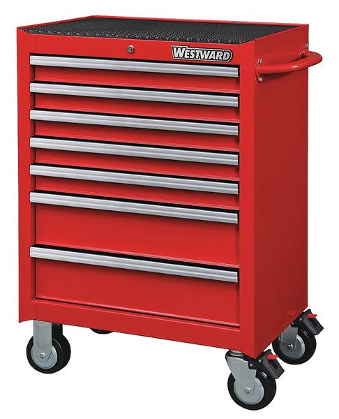 Description Rolling Tool Cabinet, Heavy Duty, Width 26 11/16 in, Depth 18 in, Height 39 7/16 in, Number of Drawers 7, Red, Drawer Color Red, Drawer Capacity 100 lb, Ball Bearing Drawer Slides, Powder Coated Finish, Storage Capacity 9,330 cu in, Load Rating 1320 lb, Caster Size 5 in x 2 in, Number of Shelves 0, Steel, Drawers: 18, Body: 20 Gauge, Work Surface Material Polyethylene Foam, Caster Wheel Material Polypropylene, Caster Type Solid, Keyed, Tubular Side Handles
