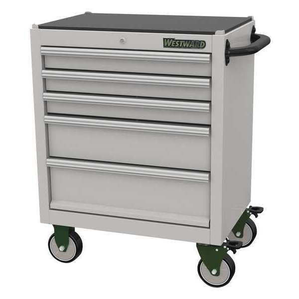 Description Rolling Tool Cabinet, Width 26 11/16 in, Depth 18 5/64 in, Height 27 49/64 in, Number of Drawers 5, Stainless Steel, Drawer Color Silver, Drawer Capacity 88 lb, Ball Bearing Drawer Slides, None Finish, Storage Capacity 7,796 cu in, Load Rating 770 lb, Caster Size 5 in x 1-1/4 in, Number of Shelves 0, Stainless Steel, 19 Gauge, Work Surface Material EVA, Caster Wheel Material Polyurethane, Caster Type Solid, Keyed, Steel Handles