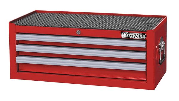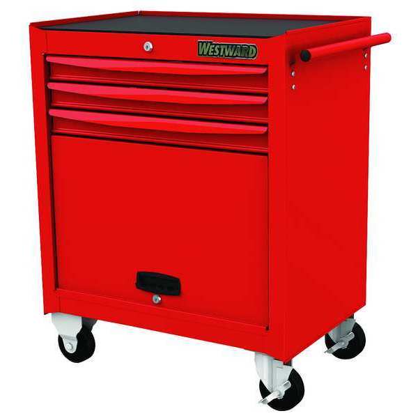 Description Rolling Tool Cabinet, Light Duty, Width 26 5/8 in, Depth 18 1/16 in, Height 28 1/2 in, Number of Drawers 3, Red, Drawer Color Red, Drawer Capacity 55 lb, Ball Bearing Drawer Slides, Powder Coated Finish, Storage Capacity 9,799 cu in, Load Rating 660 lb, Caster Size 4 in x 2 in, Number of Shelves 0, Steel, Body: 21, Drawer: 24 Gauge, Work Surface Material EVA, Caster Wheel Material Polypropylene, Caster Type Solid, Keyed, Configuration 22-3/8 in W Center Bank: (3) 15-5/8 in D x 2-3/8 in H