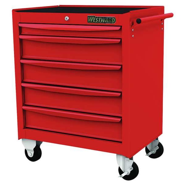 Description Rolling Tool Cabinet, Light Duty, Width 26 5/8 in, Depth 18 1/16 in, Height 28 1/2 in, Number of Drawers 5, Red, Drawer Color Red, Drawer Capacity 55 lb, Ball Bearing Drawer Slides, Powder Coated Finish, Storage Capacity 6,074 cu in, Load Rating 660 lb, Caster Size 4 in x 2 in, Number of Shelves 0, Steel, Body: 21, Drawer: 24 Gauge, Work Surface Material EVA, Caster Wheel Material Polypropylene, Caster Type Solid, Keyed