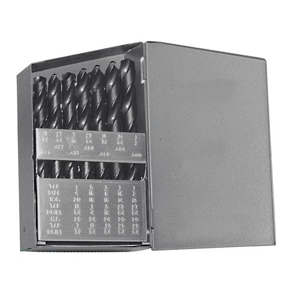 Description Screw Machine Drill Bit Set, Number of Drill Bits 21, 135 Degrees Drill Bit Point Angle, High Speed Steel, Black Oxide, Drill Bit Sizes Included 1/16 in, 1/4 in, 1/8 in, 11/32 in, 11/64 in, 13/64 in, 15/64 in, 17/64 in, 19/64 in, 21/64 in, 23/64 in, 3/16 in, 3/32 in, 3/8 in, 5/16 in, 5/32 in, 5/64 in, 7/32 in, 7/64 in, 9/32 in, 9/64 in, Fractional Inch, Drill Bit Point Type Split Point