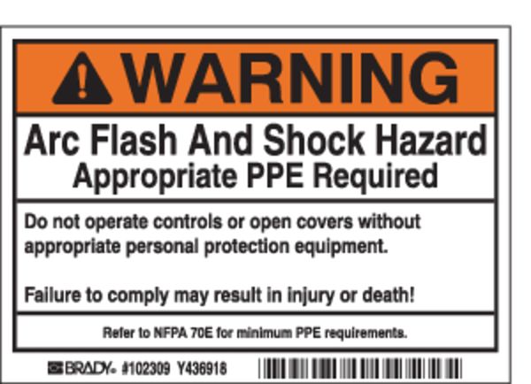 Arc Flash Protection Label, PK100, 52015SKU G5827087Categories Arc Flash ProtectionDescription Arc Flash Protection Label, Horizontal Rectangle, Number of Printed Sides 1, English, Sign Legend Arc Flash Hazard Appropriate Ppe Required Do Not Operate Controls Or Open Covers Without Appropriate Personal Protection Equipment. Failure To Comply May Result In Injury Or Death! Refer To Nfpa 70E For Minimum Ppe Requirements., Sign Legend Style Symbol and Text, Package Quantity 100graingerSKU: 2XU72, mscSKU: , zoro_no: G5827087, mongo_id: 65bbe85622d7a989a98edd02
