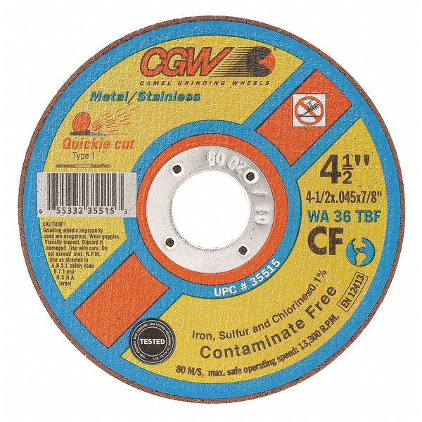 Abrasive Cut-Off Wheel, 4" dia.SKU G5602270Categories Abrasives & Polishers , Cut-Off WheelsDescription Abrasive Cut-Off Wheel, Abrasive Material Aluminum Oxide, Grit 46, Connector Size 5/8 in, Connector Type Unthreaded Hole, Overall Diameter 4 in, Overall Thickness 0.045 in, Compatible Tool Type Angle Grinder, Primary Material Applicationn Steel, Series Carbo Gold Cut, Wheel Type Type 1, Maximum Operating Speed 15,280 RPM, Reinforced Status Reinforced, Bond Type Resin$2.99 / eachWeb price -