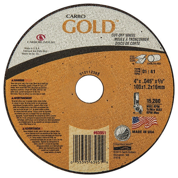 SKU G5602270Categories Abrasives & Polishers , Cut-Off WheelsDescription Abrasive Cut-Off Wheel, Abrasive Material Aluminum Oxide, Grit 46, Connector Size 5/8 in, Connector Type Unthreaded Hole, Overall Diameter 4 in, Overall Thickness 0.045 in, Compatible Tool Type Angle Grinder, Primary Material Applicationn Steel, Series Carbo Gold Cut, Wheel Type Type 1, Maximum Operating Speed 15,280 RPM, Reinforced Status Reinforced, Bond Type Resin$2.99 / eachWeb price