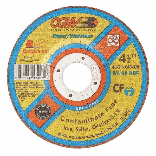 SKU 81680167Categories Abrasives & Polishers , Depressed Center WheelsDescription36 Grit, 4-1/2" Wheel Diam, 1/4" Wheel Thickness, 7/8" Arbor Hole, Type 27 Depressed Center Wheelceramic, Resinoid Bond, 13,300 Max Rpm, Compatible With Angle Grinder.