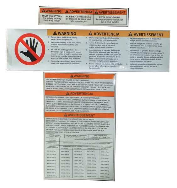 SKU G9642893Categories Material HandlingDescription Fork Truck Booms Label Kit, Includes (2) Capacity Labels, Warning Label and Securely Attach Warning Label, For Use With Grainger Item Number 4WYR7, 4WYR8, 4WYR9, 4WYT1, 4WYT2, 4WYT3, Fits Brand DaytongraingerSKU: null, mscSKU: null, zoro_no: G9642893, mongo_id: 65bbe6c93aaddbd5a9052f64