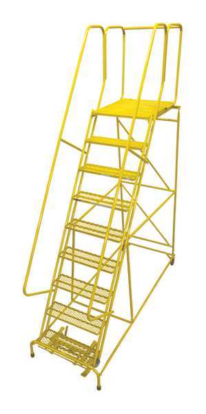 SKU G3491595Categories Material HandlingDescription Rolling Ladder, Material Steel, Platform Height 90 in, Handrails Included Yes, Handrail Height 30 in, Overall Height 120 in, Number of Steps 9, Unassembled, Load Capacity 450 lb, Step Tread Perforated, Platform Depth 30 in, Platform Width 24 in, Bottom Width 33 in, Base Depth 120 in, Overall Width 32 in, Climbing Angle 59 Degrees , Step Depth 7 in, Step Width 24 in, Ladder Actuation Foot Activated Step Lock, Finish Powder Coated, Color Yellow, Standards ANSI, OSHA, Rear Exit NograingerSKU: null, mscSKU: null, zoro_no: G3491595, mongo_id: 65bbe5e43aaddbd5a9ff39c1