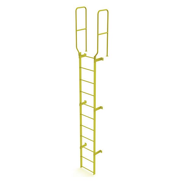 13 ft. 6" Ladder, Walk-Thru Fixed, Steel, 11-Rung, Steel, 11 Steps, Top Exit, Safety Yellow FinishSKU G2281848Categories Material HandlingDescription Fixed Ladder, Walk-Thru Included Yes, Exit Top, Overall Height 14 ft, Overall Width 28 in, Material Steel, Load Capacity 450 lb, Number of Steps 11, Top Step Height 10 ft, Rung Dia. 3/4 in, Rung/Step Spacing 12 in, Step Width 18 in, Finish Safety Yellow, Standards ANSI; OSHA Compliant, Includes 42 In. guardrails, Manufacturers Warranty Length 1 yrgraingerSKU: null, mscSKU: null, zoro_no: G2281848, mongo_id: 65bbe5e43aaddbd5a9ff397b