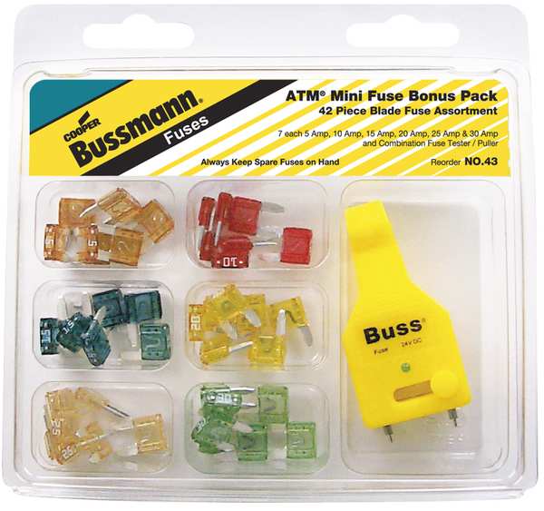Blade Fuse Kit, 42, ATM, Automotive Fuse KSKU G1625522Categories Automotive toolsDescription Fuse Kit, Automotive Blade Fuse Kit, Total Number of Fuses Included 42, Fuse Series Included ATM, Fuse Class No Fuse Class, Not Rated, 32V DC, Fuse Kit Amp Range 5 to 30 A, Fuses Included (7) ATM 5, 10, 15, 20, 25, 30, Tool Included (1) FT-3 Fuse Tester/Puller, Nonindicating, Fast Acting, Body Style Blade, Body Material Plastic, Standards RoHS, UL Listed$44.61 / eachWeb price -