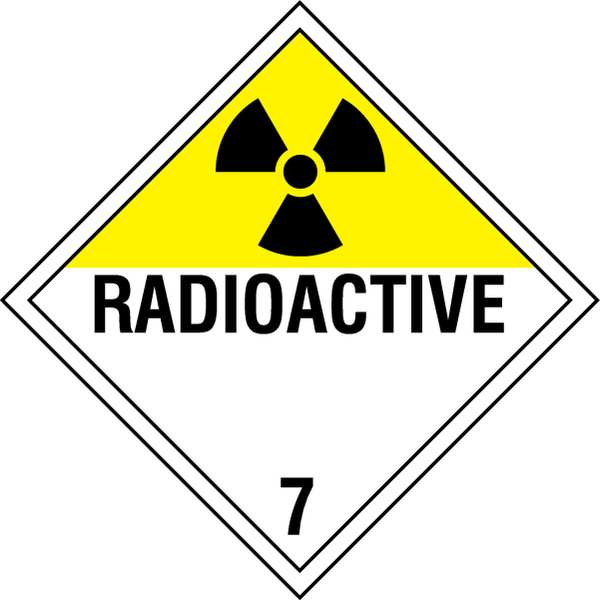 Description DOT Container Placard, Language English, Container Label/Placard Type Hazardous Class, Hazard Class Class 7 (Radioactive), DOT/UN Product Form Placard, Message Radioactive, Label Width 10 3/4 in, Label Height 10 3/4 in, Material Rigid Styrene