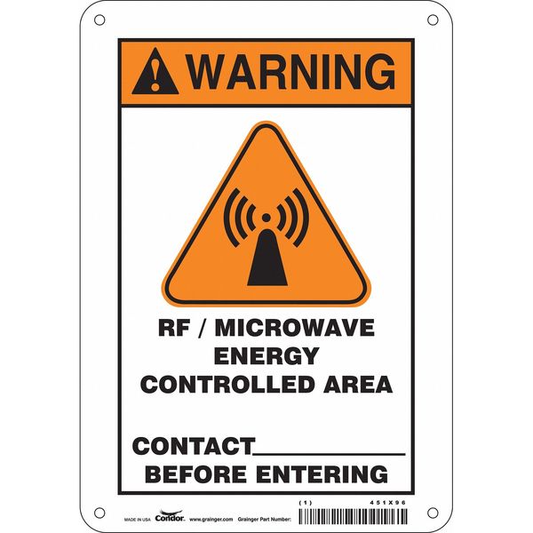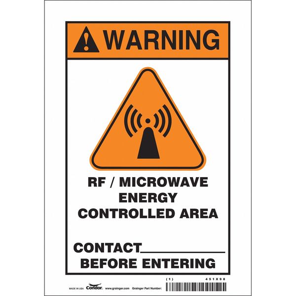 Safety Sign Radiofrequency/Microwave, 10 in Height, 7 in Width, Vinyl, Horizontal RectangleSKU G5793571Categories Radio , SafetyDescription Safety Sign Radiofrequency/Microwave, Horizontal Rectangle, Number of Printed Sides 1, English, Sign Format ANSI/OSHA Format, Sign Legend Rf/Microwave Energy Controlled Area Contact ____ Before Entering, Sign Legend Background Color White, Sign Legend Style Symbol and TextgraingerSKU: 451X98, mscSKU: , zoro_no: G5793571, mongo_id: 65bbe94522d7a989a9944073